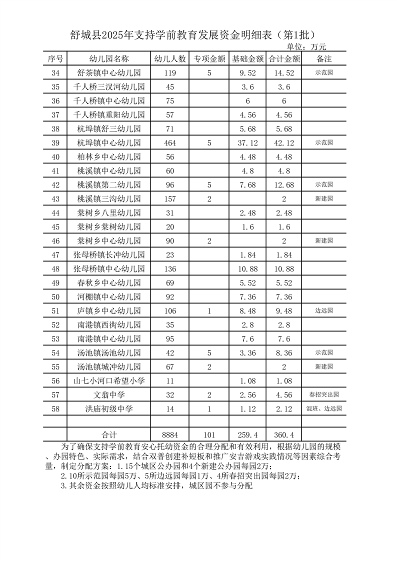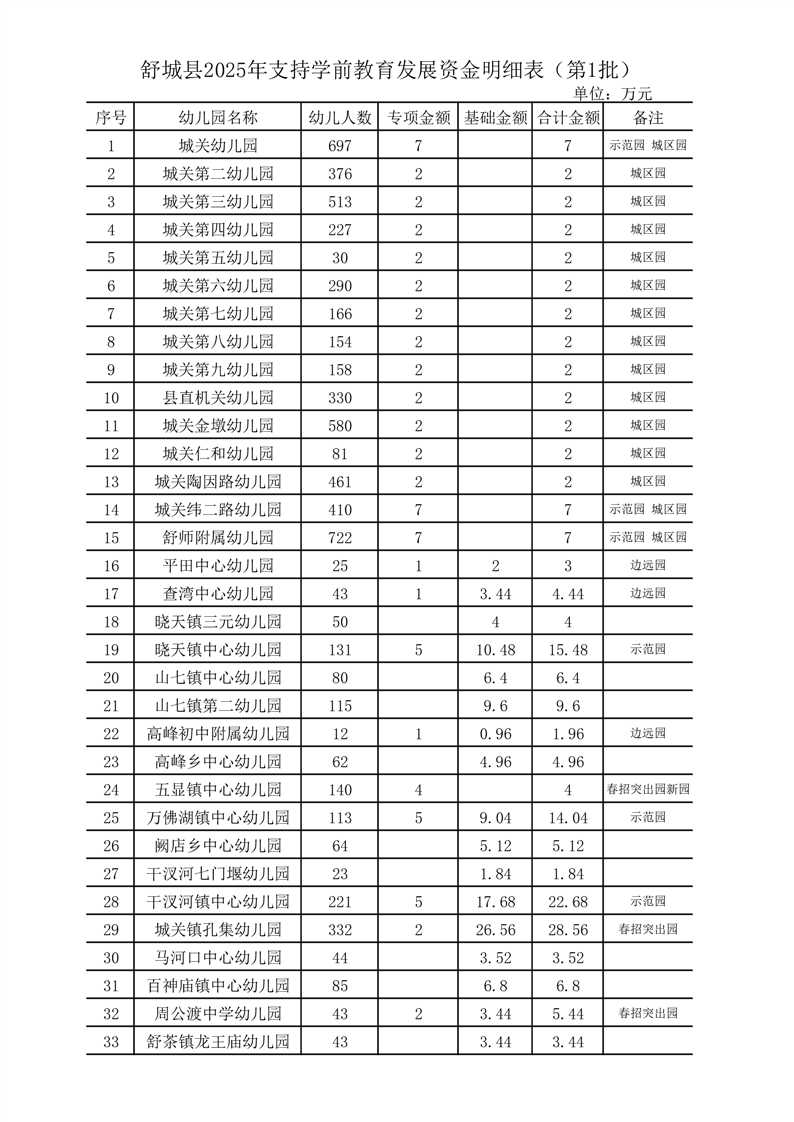 舒城县2025年支持学前教育发展资金分配明细表(含舒茶镇)
