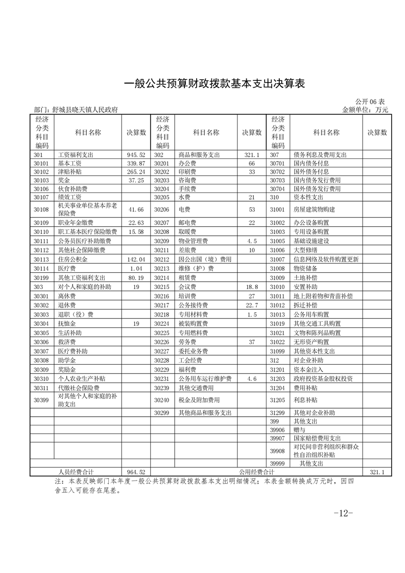 舒城县晓天镇2020年度部门决算