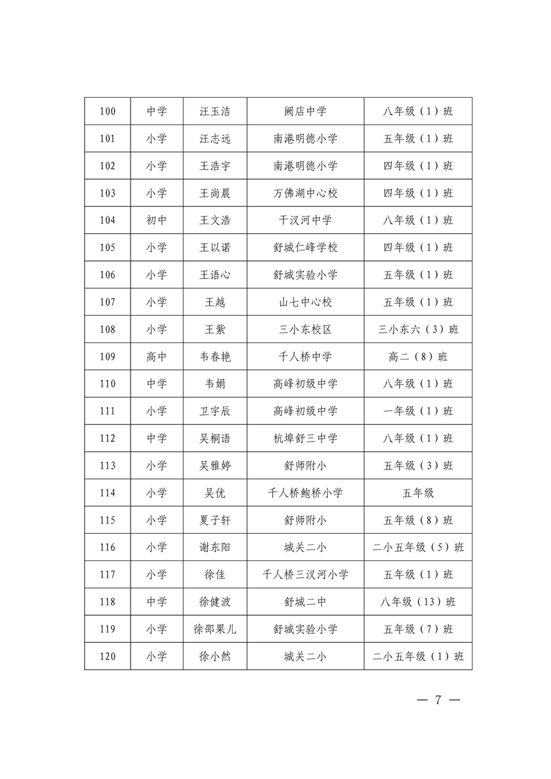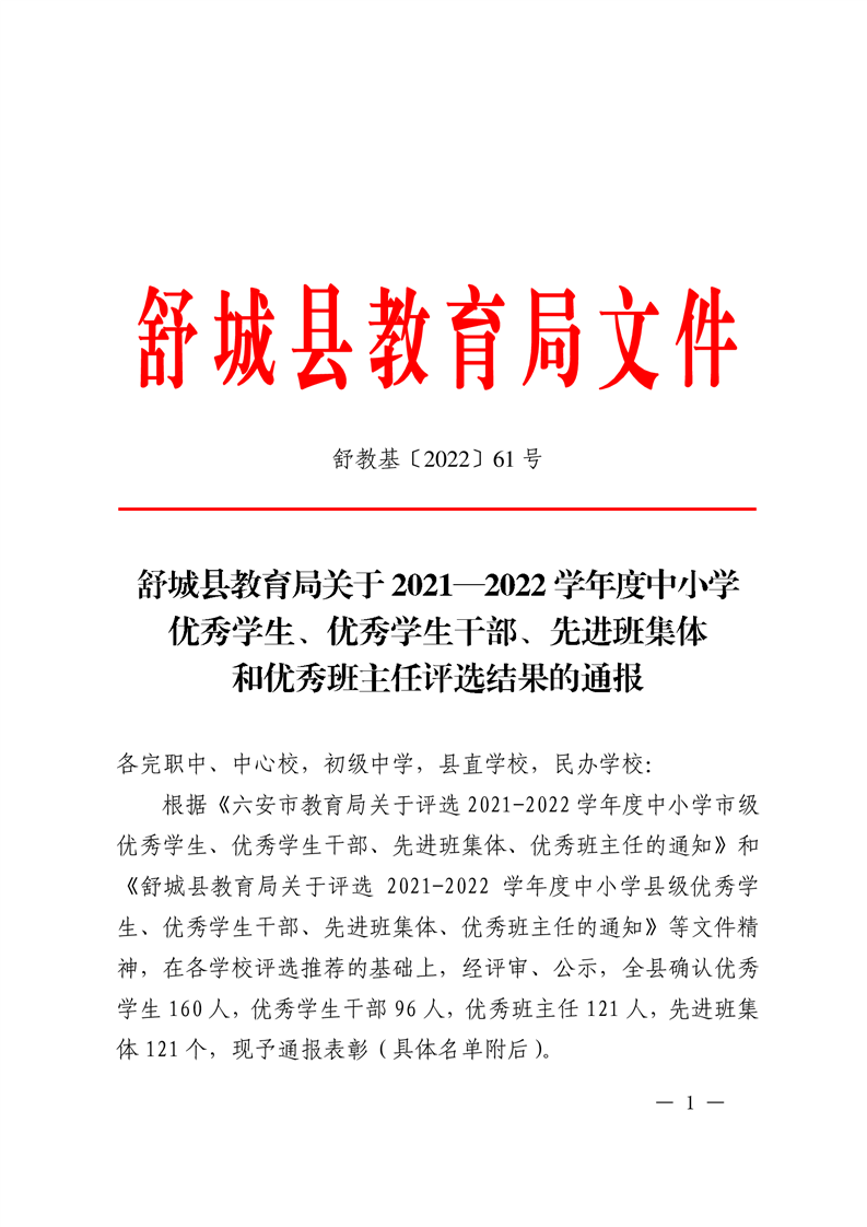 舒城县教育局关于2021-2022学年度中小学优秀学生、优秀学生干部、先进班集体和优秀班主任评选结果的通知
