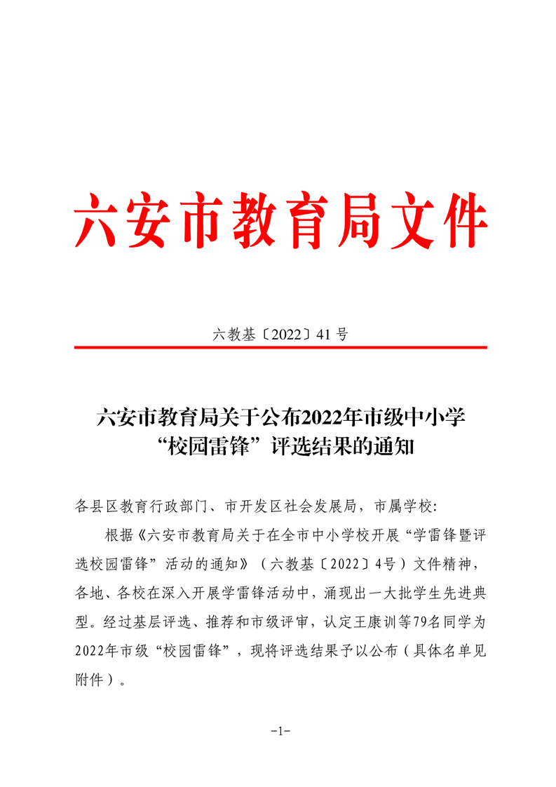 六安市教育局关于2022年市级中小学“校园雷锋”评选结果的通知 |